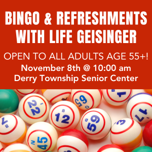 All adults age 55 and older are invited to a fun morning of Bingo & Refreshments in partnership with LIFE Geisinger! Centers In Motion is hosting this activity on November 8th at 10:00am at the Derry Township Senior Center, 15 West Mill Street in Yeagertown. Call 717-320-8354 to speak with Mackenzie Yohn for more information about this event or to learn more about Centers In Motion.