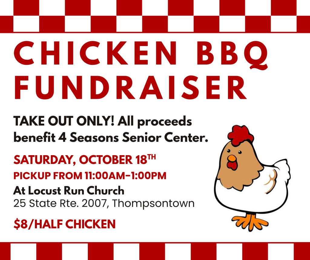 Support the 4 Seasons Senior Center! The Chicken BBQ Fundraiser is taking place on October 18th. Tickets are $8 for half a chicken. Pickup will be from 11am to 1pm, hosted at Locust Run Church in Thompsontown. Tickets are on sale now at the Center. Chicken will be first come first serve after all the ticket holders are accounted for! Contact Jody Ehrisman for more information: 717-436-6847 or send an email to 4seasonsctr@mymjrsc.com.