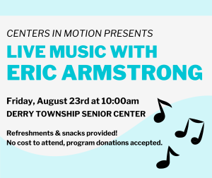 Centers In Motion presents LIVE MUSIC with Eric Armstrong! Join the fun on Friday, August 23rd at Derry Township Senior Center, 15 W. Mill Street in Yeagertown. Music will begin at 10:00am. Refreshments and snacks are provided! Centers In Motion is for adults 55 and older from Mifflin and Juniata Counties. There’s no cost to attend, program donations are welcome. For more information, please contact Beth Harlan at 717-320-8367.