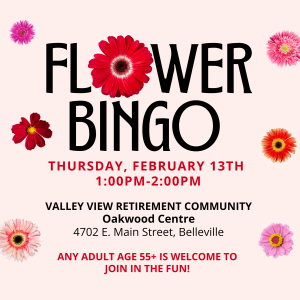 We’re hosting Fresh Flower Bingo at Valley View’s Oakwood Centre. Any adult age 55+ is welcome to join in the fun! Bingo prizes will be fresh flowers.