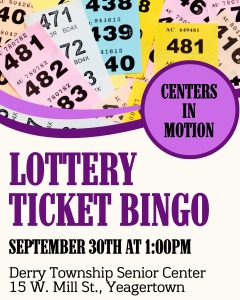 Lottery Ticket Bingo is coming to Derry Township Senior Center! Join us on Monday, September 30th at 1:00pm. Centers In Motion programming is open to all area adults who are 55 and older. Contact Beth Harlan for more information: call 717-320-8367 or send an email to bharlan@mymjrsc.com.