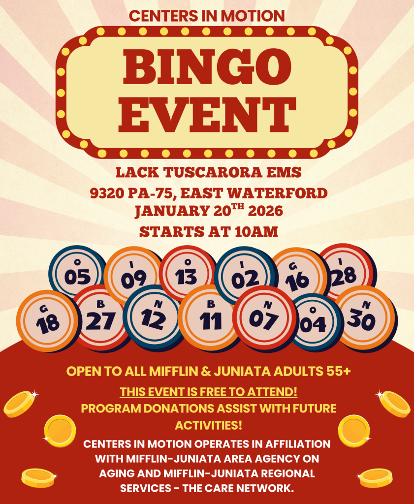 All adults 55+ are invited to participate in Centers In Motion Bingo at the Lack Tuscarora EMS Building, 9320 RT. 75 South in East Waterford. The event is free to attend. Donations are appreciated to help assist with future activities!