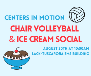 Chair Volleyball & Ice Cream Social! Join us at the Lack-Tuscarora EMS Building, 9320 RT. 75 South, East Waterford. The event begins at 10:00am and is open to anyone 55 or older. Chair Volleyball is a fun, fast-paced game that provides a cardio and upper body workout! Beginners welcome. There is no cost to attend, donations are appreciated. New friends are welcome!