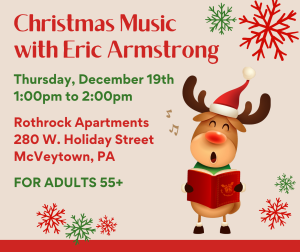 Refreshments & holiday snacks provided! No cost to attend, program donations accepted. This event is open to the public. Centers In Motion programming is for active seniors age 55 and older in Mifflin and Juniata Counties. Come check it out! Call Mackenzie Yohn at 717-320-8354 if you have any questions or would like to get involved in planning programming.