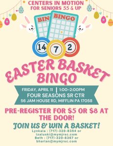 Join us at the NEW 4 Seasons Senior Center in Mifflin, PA. All local adults 55+ are welcome. Pre-register for this event for $5 or pay $8 at the door. Contact Lynkala Zaluski at 717-320-8354 or Beth Harlan at 717-320-8376 to RSVP! You can also send an email to lzaluski@mymjrsc.com or bharlan@mymjrsc.com.