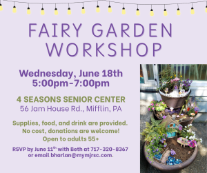Come make a Fairy Garden on Wednesday, June 18th from 5:00pm-7:00pm. Supplies, food, and drink are provided. No cost, donations are welcome! The activity is hosted at 4 Seasons Senior Center, 56 Jam House Road in Mifflin. All adults 55+ are welcome! RSVP by June 11th with Beth at 717-320-8367 or email bharlan@mymjrsc.com.