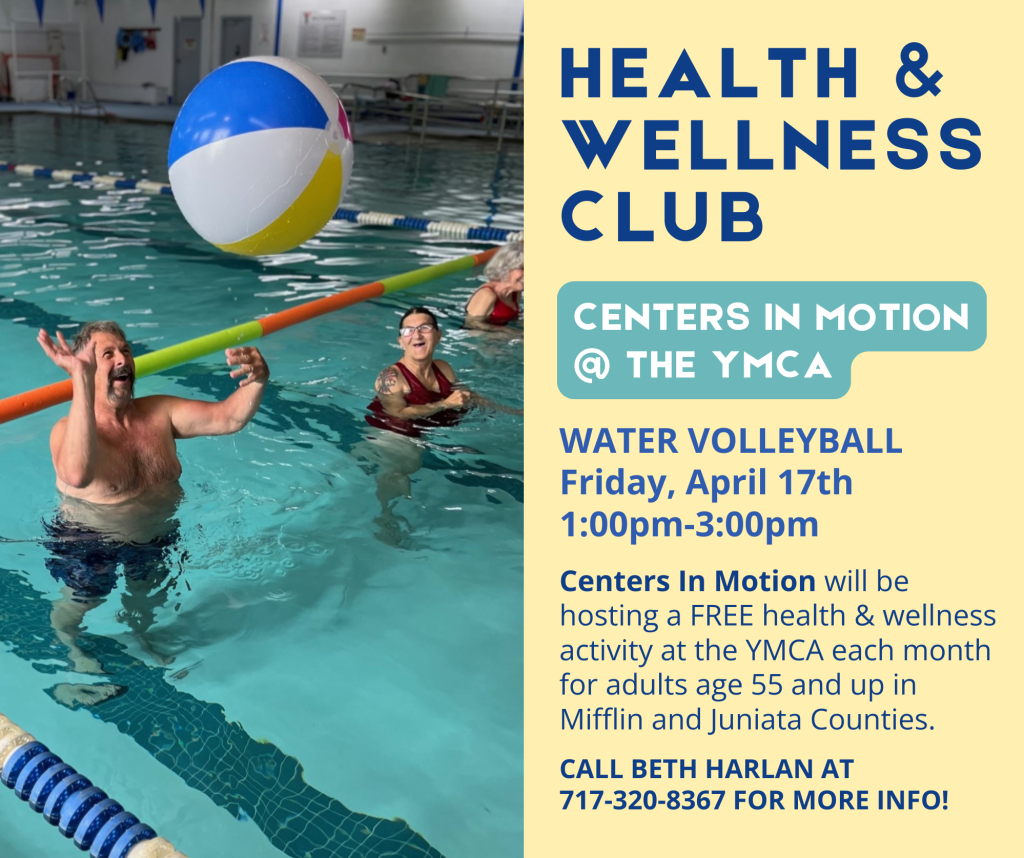 Play Water Volleyball with us on April 17th from 1:00pm-3:00pm! Centers In Motion will be hosting a health & wellness activity at the YMCA each month. These events are FREE and open to all adults age 55 and up in Mifflin and Juniata Counties. The Juniata Valley YMCA is located at 105 1st Avenue, Burnham. Program donations are appreciated. Call Beth Harlan at 717-320-8367 for more information!