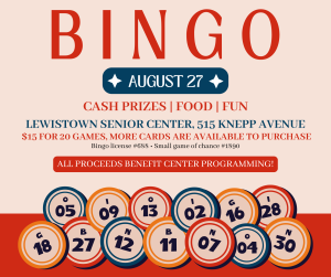 Lewistown Senior Center is hosting a Bingo Fundraiser on August 27th at 515 Knepp Avenue in Lewistown. Food is available starting at 4:00pm, including hot dogs, soup, and desserts. Early bird games begin at 5:00pm! $15 for 20 games, additionally cards will be available for purchase. All proceeds benefit Lewistown Senior Center. We hope to see you there!