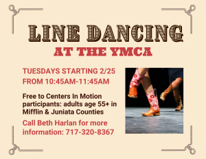 We’re partnering with The Juniata Valley YMCA to provide Line Dancing for Centers In Motion! This activity will run for 6 weeks on Tuesdays from 10:45am-11:45am, starting on February 25th. Sessions are beginner friendly, no experience needed. Music will include country music dances, the electric slide, oldies songs, and more! This activity is free to Centers In Motion participants, which is for all adults age 55+ in Mifflin and Juniata Counties. Call Beth Harlan for more information: 717-320-8367.
