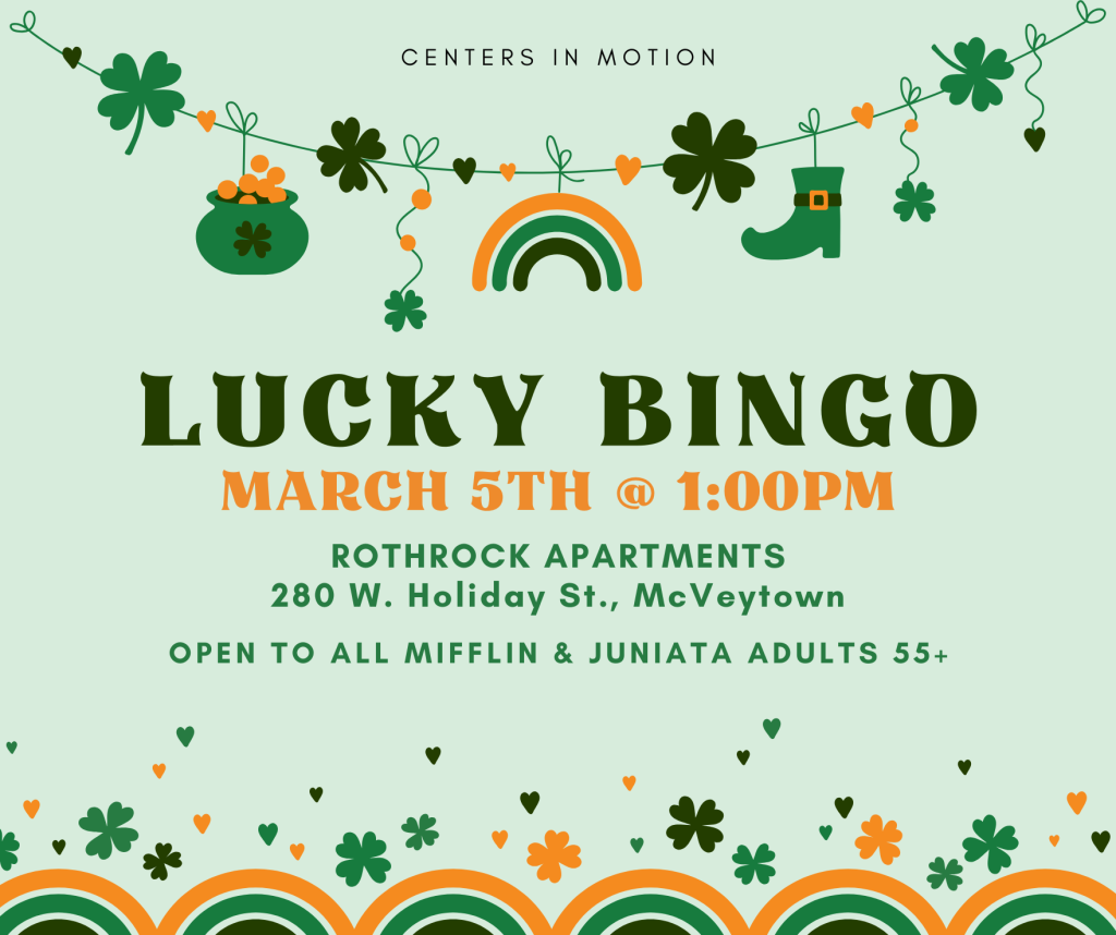 Join us for LUCKY BINGO on March 5th at Rothrock Apartments, 280 W. Holiday Street in McVeytown. Bingo begins at 1:00pm and is open to all adults 55+, not just residents of the apartment building. This event is free to attend! Program donations assist with future activities. Call Lynkala Zaluski at 717-320-8354 with any questions.