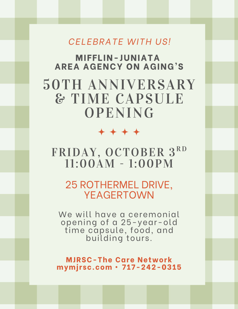 You’re invited to come celebrate with us as we recognize 50 years of the Mifflin-Juniata Area Agency on Aging! We will also have a ceremonial opening of a 25-year-old time capsule, food, and building tours for those who are interested.