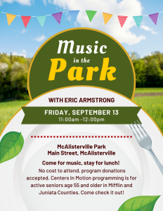 Centers In Motion will be at McAlisterville Park for music & lunch on September 13th! All adults age 55+ in Mifflin and Juniata Counties are welcome. For more information, contact Beth Harlan at 717-320-8367 or bharlan@mymjrsc.com.