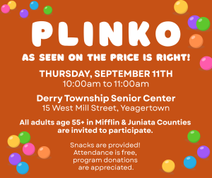 Come play PLINKO from The Price Is Right! Centers In Motion will be hosting this event on Thursday, September 11th from 10:00am to 11:00am at the Derry Township Senior Center. The center is located at 15 West Mill Street, Yeagertown. All adults age 55+ in Mifflin and Juniata Counties are invited to participate. Snacks are provided! It is free to attend, program donations are appreciated. For more info on this and other Centers In Motion events, call 717-320-8354 or email lzaluski@mymjrsc.com.