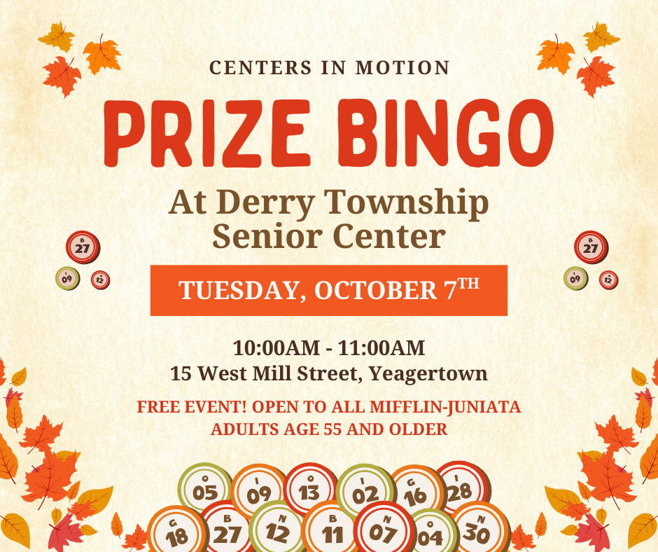 Prize Bingo is coming to the Derry Township Senior Center on October 7th! Centers In Motion is presenting this FREE activity to all local adults age 55+ from 10:00am to 11:00am. The center is located at 15 West Mill Street in Yeagertown. For more information, call 717-320-8354.