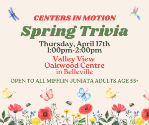 Play Spring Trivia at Valley View’s Oakwood Centre! This event is open to all Mifflin-Juniata adults age 55+, not just residents of Valley View. Snacks are provided. Free to attend, donations are appreciated. Call 717-320-8354 for more information.