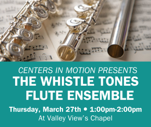 Centers In Motion is hosting The Whistle Tones Flute Ensemble this month! Join us on March 27th at 1:00pm to enjoy songs of the 1930s in Valley View’s Chapel. This FREE public event is open to all area adults age 55 and older. Program donations are welcome.