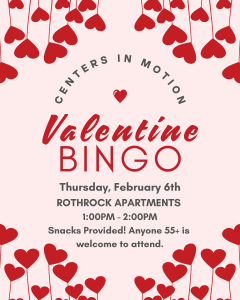 Join us for Valentine’s Bingo at Rothrock Apartments, 280 W. Holiday Street in McVeytown, on February 6th! This FREE event is from 1PM-2PM, and is open to all Mifflin-Juniata adults age 55 and older. Snacks are provided. Program donations are welcome!