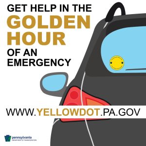 This program assists citizens in the “golden hour” of emergency care following a traffic crash when they may not be able to communicate their needs themselves. Placing a Yellow Dot decal in your vehicle’s rear window alerts first responders to check your glove compartment for vital information to ensure you receive the medical attention you need. The program is a cooperative effort between PennDOT, the state departments of Health and Aging, the Pennsylvania State Police, the Pennsylvania Turnpike Commission, first responders, and local law enforcement.
